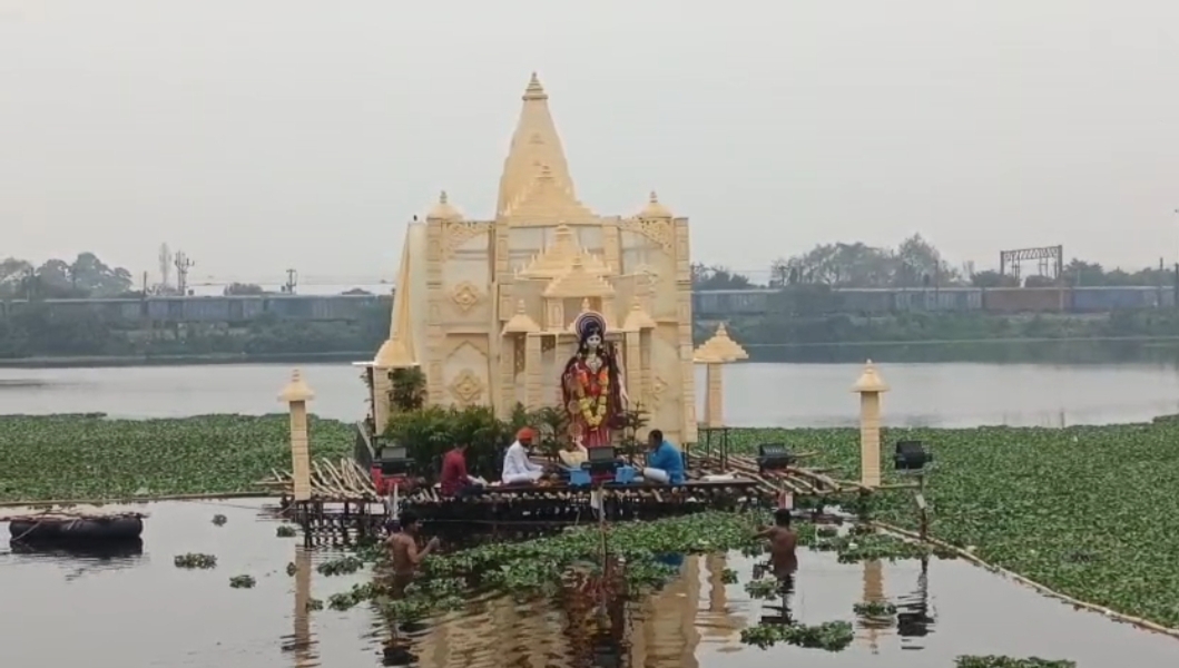 धनबाद में सरस्वती पूजा की धूम, शहर के पंपू तालाब में बनाया गया अयोध्या का राम मंदिर
