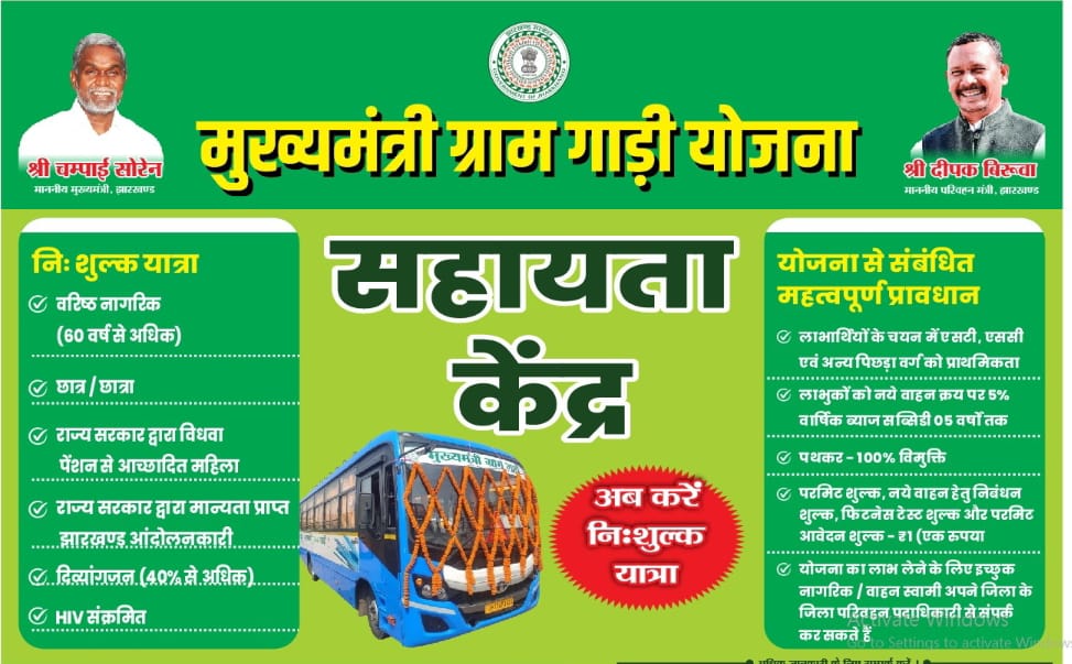 DHANBAD : मुख्यमंत्री ग्राम गाड़ी योजना के प्रचार प्रसार हेतु मंगलवार को धनबाद बरटांड़ बस स्टेंड से जिला परिवहन पदाधिकारी दिवाकर सी दिवेदी ने हरी झंडी दिखाकर जागरूकता रथ रवाना किया। इस दौरान जिला परिवहन पदाधिकारी ने बताया की झारखंड के मुख्यमंत्री महत्वकांक्षी योजना है। गाड़ी सुदूर क्षेत्रों से जिला मुख्यालय तक चलेगी जिससे सुदूर ग्रामीण क्षेत्रों से लोगो को आने जाने में सोहलियत होगी। खास बात है की वरिष्ठ नागरिकों, छात्र/छात्रा, राज्य सरकार के पेंशनधारी, झारखंड आंदोलनकारी को यात्रा सेवा दी जाएगी, जबकि अनुसूचित जाति, जनजाति, दिवायंग को 40% की छूट मिलेगी। वही योजना के तहत गाड़ी लेने पर 5% वार्षिक ब्याज पर छूट मिलेगी साथ ही किसी भी तरह का टैक्स माफ रहेगा।
