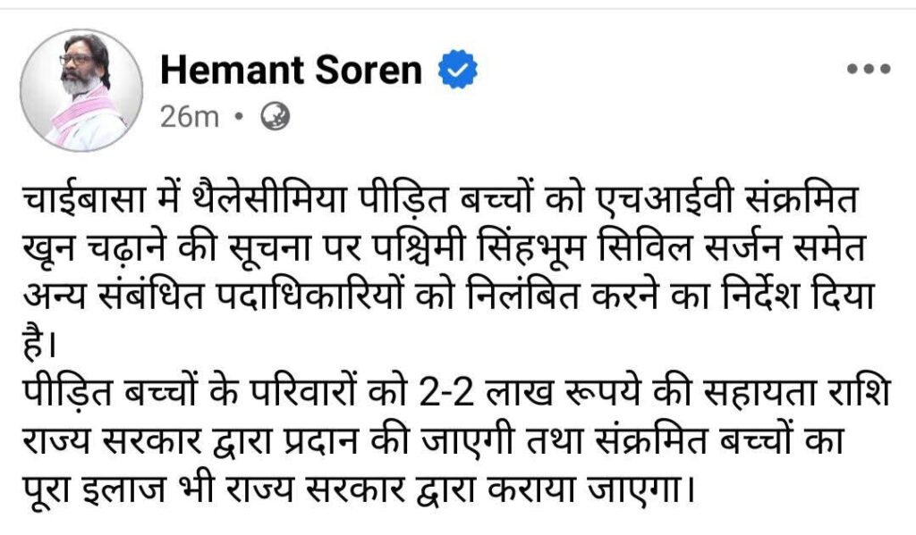 RANCHI: रांची झारखंड के चाईबासा में थैलेसीमिया पीड़ित बच्चों को एचआईवी संक्रमित खून चढ़ाने की खबर सामने आने के बाद राज्य सरकार हरकत में आ गई है। मुख्यमंत्री हेमंत सोरेन ने इस गंभीर लापरवाही पर तत्काल संज्ञान लेते हुए पश्चिमी सिंहभूम सिविल सर्जन समेत अन्य संबंधित अधिकारियों को निलंबित करने का आदेश दिया है।