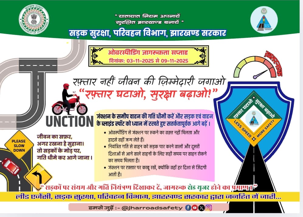 DHANBAD: उपायुक्त आदित्य रंजन के निर्देश पर जिला परिवहन पदाधिकारी दिवाकर सी द्विवेदी के नेतृत्व में आज परिवहन विभाग ने ओवर स्पीडिंग जागरूकता सप्ताह के तहत “रफ्तार घटाओ सुरक्षा बढ़ाओ” अभियान चलाया। अभियान के पहले दिन धनबाद के सिटी सेंटर चौक के पास चार पहिया, दोपहिया, ऑटो तथा टोटो चालकों के बीच जागरूकता अभियान चलाया गया।